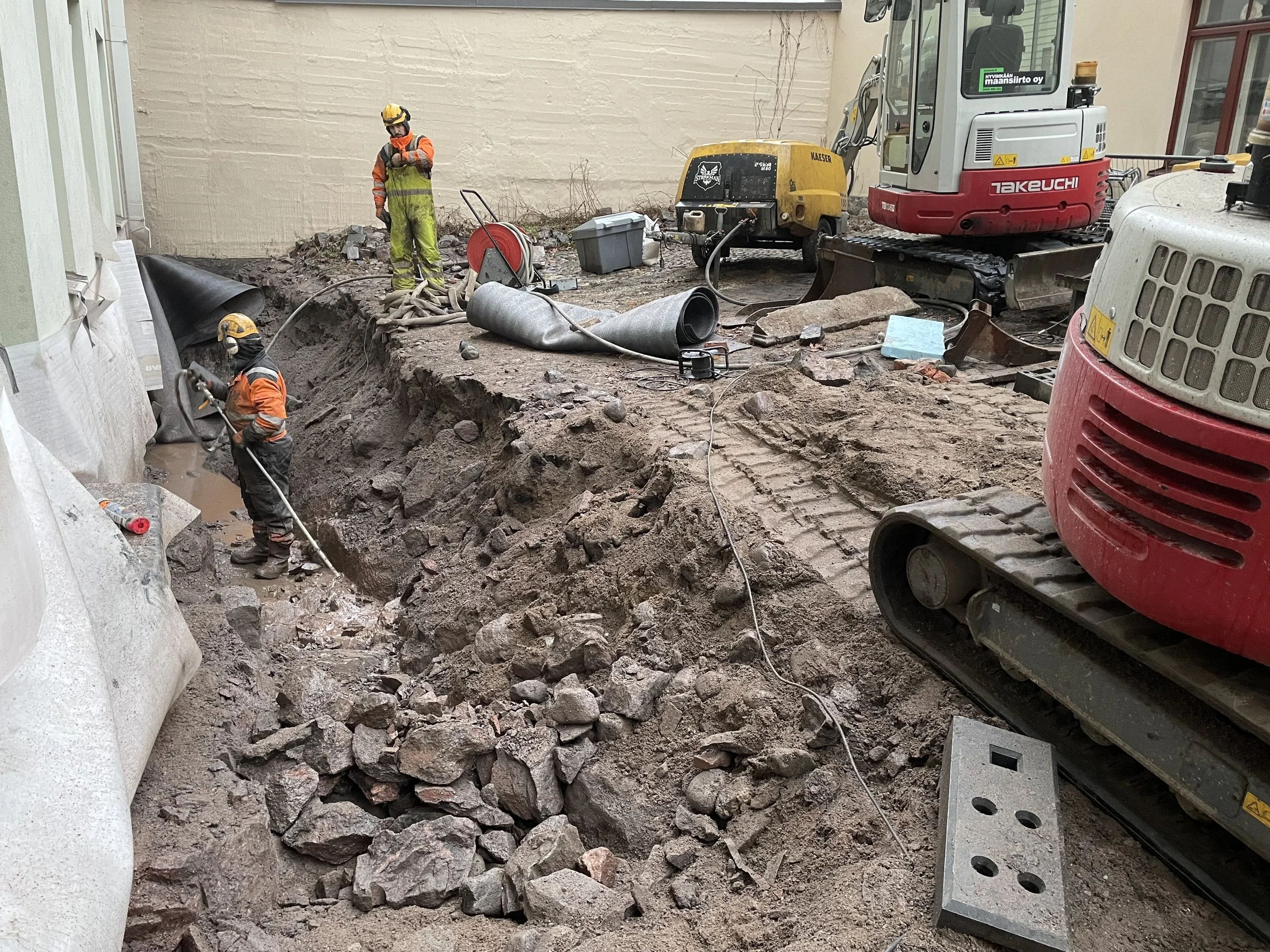 Sokkelin vedeneristyskorjaukset ja piharemontin rakennesuunnittelu. Nykyiset sokkelit vedeneristettiin ja pihan sadevesi- ja salaojajärjestelmät uusittiin. Projektiin kuului lisäksi pihatyöremontin valvominen