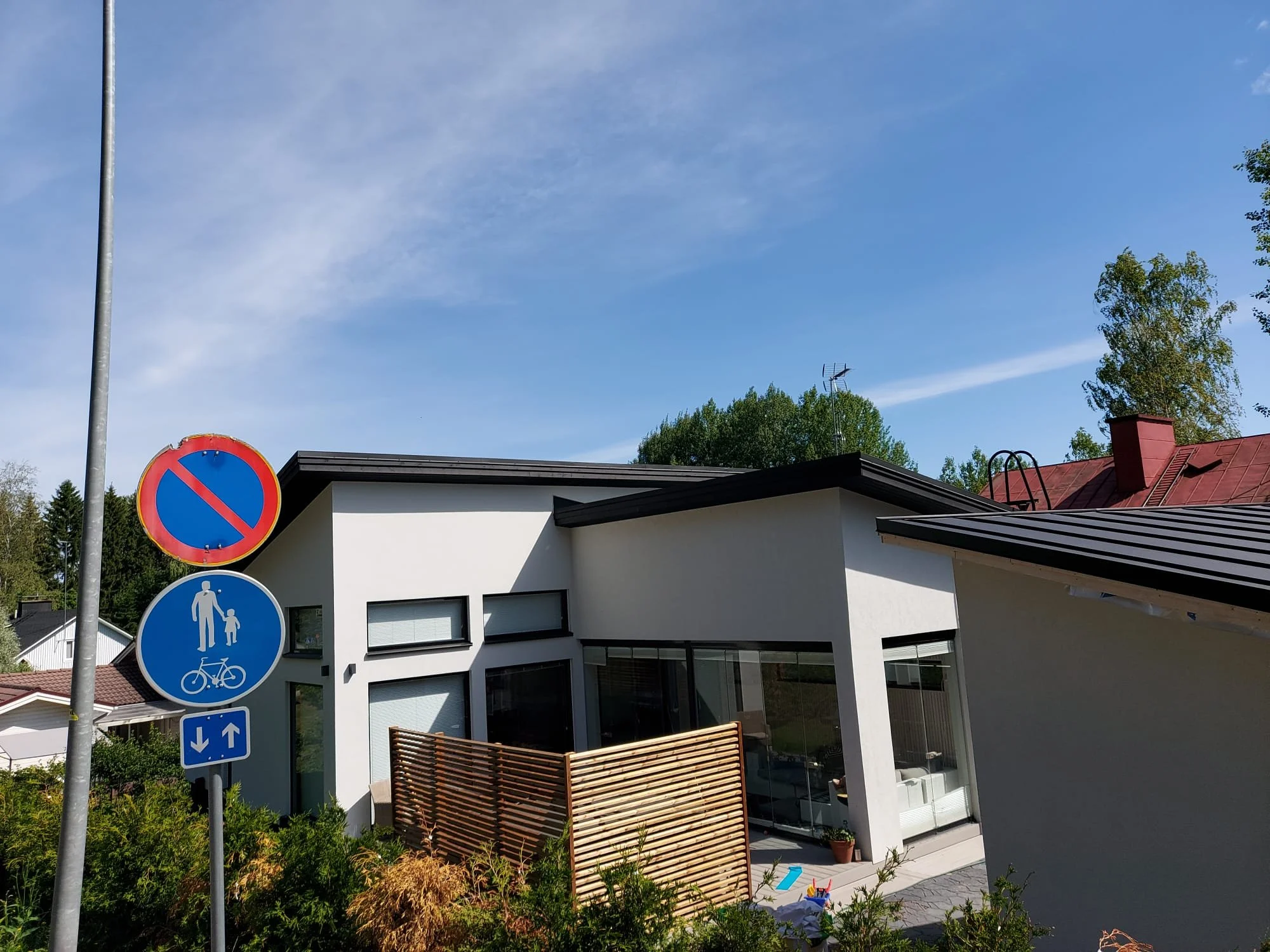 Puurunkoinen yksikerroksinen omakotitalo ja autokatos. Rakennus perustettiin paalujen päälle ja ulkorunko tuli puuristikkoelementeistä. Rakennus on lentomelualueella ja tämä huomioitiin rakenteissa.